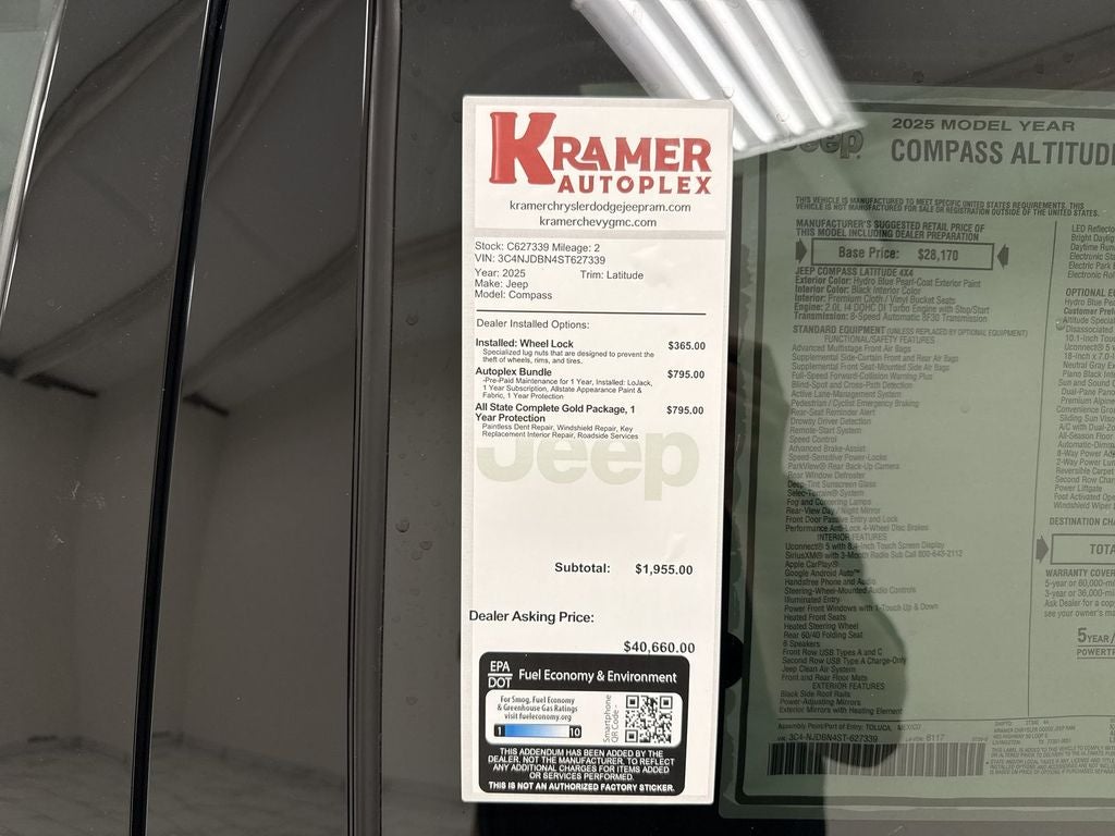 Keep your hands warm all winter with a heated steering wheel in this model . Never get into a cold vehicle again with the remote start feature on it. This Jeep Compass's Forward Collision Warning feature alerts drivers to potential front-end collisions. See what's behind you with the back up camera on this Jeep Compass. This unit features a hands-free Bluetooth® phone system. This 2025 Jeep Compass comes equipped with Android Auto for seamless smartphone integration on the road. Apple CarPlay: Seamless smartphone integration for this Jeep Compass - stay connected and entertained on the go! This 2025 Jeep Compass has a 4 Cyl, 2.0L high output engine. This model has four wheel drive capabilities. Electronic Stability Control is one of many advanced safety features on this unit. Easily set your speed in it with a state of the art cruise control system. Increase or decrease velocity with the touch of a button.