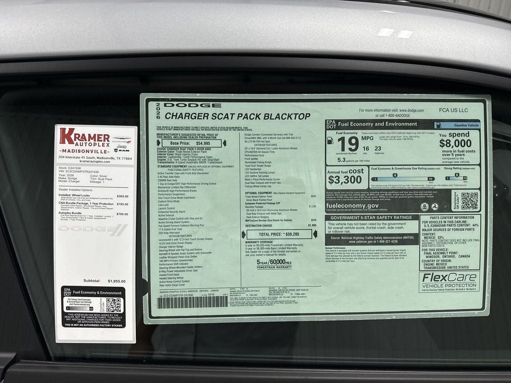 Blacktop Package: Dark Exterior Badging; Dual Rear Exhaust with Black Tips; 20" X 10" Dark Finish Aluminum Wheels. Quick Order Package 22P Scat Pack. Triple Nickel. MyFlexCare Service Plan. **Equipment listed is based on original vehicle build and subject to change. Please confirm the accuracy of the included equipment by calling the dealer prior to purchase.**