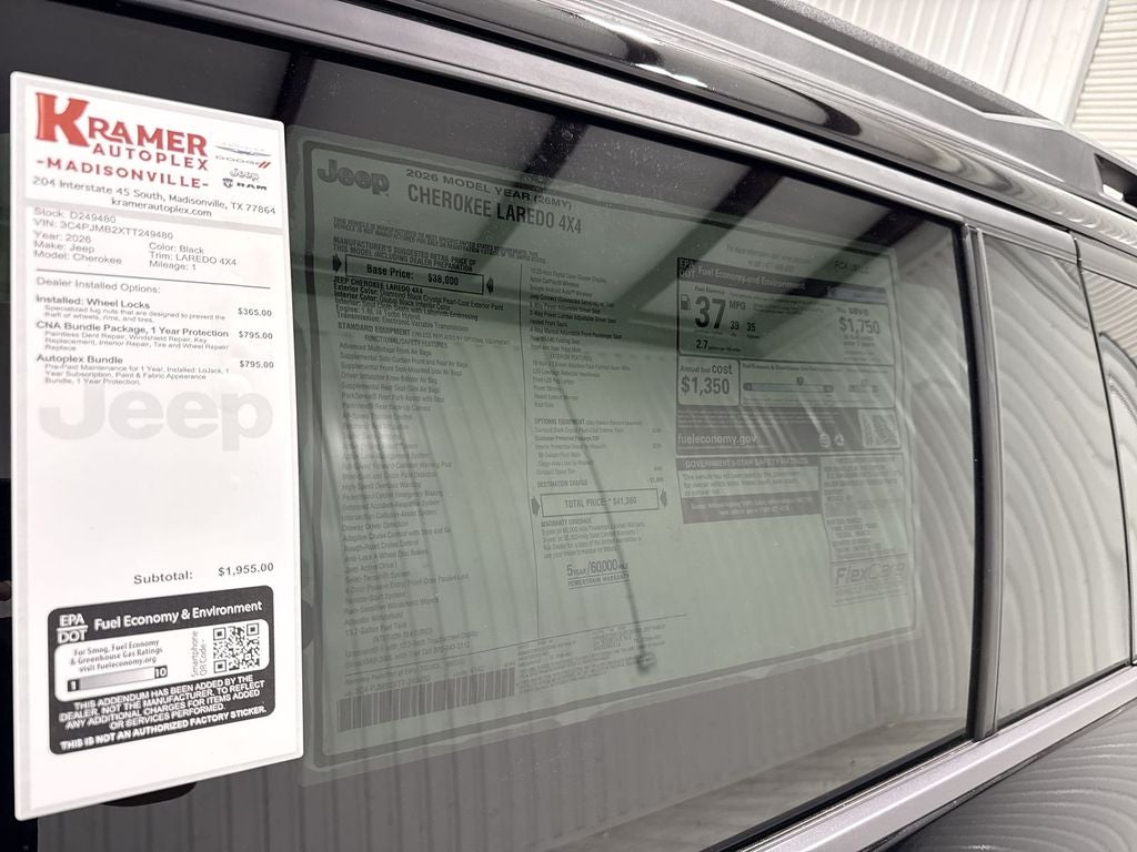 Discover the 2026 Jeep Cherokee Laredo 4WD with a fuel-efficient 4-cylinder 1.6L Full Hybrid Electric (FHEV) powertrain—now available in Madisonville, TX. This Jeep Cherokee Laredo blends rugged capability with modern efficiency, featuring a capable Off-Road Package that equips weekend explorers for trails and tough terrain. Navigate confidently with Forward Collision Warning for added safety and peace of mind on busy highways and winding country roads. Enjoy connected driving with Hands Free Bluetooth® and Android Auto, making calls, streaming music, and accessing navigation apps effortlessly. Warm up or cool down before you get in using Remote Start, perfect for Texas weather extremes. The 4WD system delivers traction when you need it most, while the hybrid drivetrain helps maximize fuel economy without sacrificing performance. This 2026 Jeep Cherokee Laredo is competitively priced and advertised as the best price in Madisonville, TX, offering exceptional value for drivers seeking capability, comfort, and advanced technology. Whether commuting, towing, or weekend adventuring, this Jeep delivers a versatile driving experience backed by contemporary safety and convenience features. Schedule a test drive today in Madisonville, TX, and experience the 2026 Jeep Cherokee Laredo 4WD FHEV for yourself. Drive home a well-equipped, efficient SUV at the best price available locally.