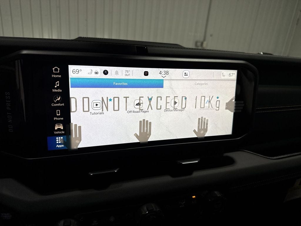 Convenience Group: Emergency/Assistance Call; Front Door Locks 2-Door Passive Entry; Remote Start System; Cluster 7.0" TFT Color Display; Universal Garage Door Opener; Daytime Running Lamp System; Heated Front Seats; Air Conditioning W/Auto Temp Control; Heated Steering Wheel; Corning Gorilla Glass. Quick Order Package 24J Texas Trail: Leather Wrapped Shift Knob; Premium Door Trim Panel; Side Steps; LT255/75R17C Tires; Power 4-Way Passenger Lumbar Adjust; Power 4-Way Driver Lumbar Adjust; Body Color Fender Flares (2-Piece); Power Adjust 8-Way Front Passenger Seat; Security Alarm; Rear Armrest W/Cupholder Seat; Hard Seat Back; Advanced Brake Assist; Willys Suspension; Body Color 3-Piece Hard Top; Texas Trail; Automatic Headlamps; 5. 950 lbs GVWR; Deep Tint Sunscreen Windows; 17" X 7.5" Painted Black Wheels; Central ADAS Decision Module (CADM); Premium McKinley Trimmed Seats; Full Speed Forward Collision Warning Plus; Power Heated Mirrors; Daytime Running Lamp System; Power Adjust 8-Way Driver Seat; Full Length Floor Console Premium Armrest; Premium Wrapped Steering Wheel; Leather Wrapped Park Brake Handle; Sun Visors W/Illuminated Vanity Mirrors; Texas Trail Tailgate & Hood Decals. LED Headlamp & Fog Lamp Group: Daytime Running Lamps LED Accents; Front LED Fog Lamps; LED Premium Reflector Headlamps. Trailer Tow & Aux Switch Group: Heavy Duty Engine Cooling; Auxiliary Switches; Trailer Hitch Zoom; Class IV Receiver Hitch. MOPAR Hardtop Headliner. Black Clearcoat. MOPAR Spray In Bedliner. MOPAR Satin Black Grille W/Satin Black Ring. MOPAR All-Weather Slush Mats. **Equipment listed is based on original vehicle build and subject to change. Please confirm the accuracy of the included equipment by calling the dealer prior to purchase.**