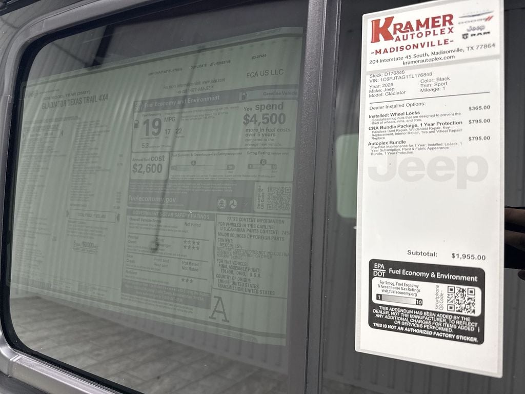 2026 Jeep Gladiator Texas Trail 4WD — ready for work and weekend adventures, located in Madisonville, TX. This rugged mid-size truck pairs a proven 3.6L V6 gasoline engine with reliable 4WD capability to deliver confident towing, off-road traction, and smooth highway performance. The Texas Trail trim balances utility and comfort with premium leather seats, automatic climate control, and a well-appointed interior designed for long drives and daily tasks. Safety and convenience features include a Back-Up Camera for easier parking and trailer hookup, hands-free Bluetooth® connectivity for safer calls and streaming, and Android Auto integration to keep navigation and apps at your fingertips. Practical touches like durable bed space and trail-ready suspension make this Jeep Gladiator an ideal choice for outdoor enthusiasts who need serious capability without sacrificing comfort. Priced to move, this Jeep Gladiator Texas Trail offers the best price in the area — a competitive value when comparing capability, features, and condition. Located in Madisonville, TX, the vehicle is available for immediate test drives and inspection. Whether you need a dependable work truck, a weekend trail rig, or a versatile daily driver, this Jeep Gladiator combines off-road DNA with modern technology and creature comforts. Contact us to schedule your test drive and see why this Jeep Gladiator stands out as the best-priced option nearby.