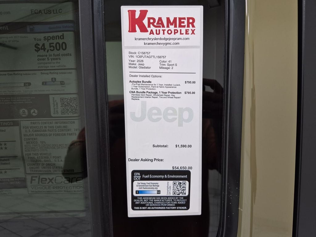 2026 Jeep Gladiator Sport S 4WD — V6 3.6L Gasoline, Livingston TX Find exceptional capability and rugged style with this 2026 Jeep Gladiator Sport S, located in Livingston TX. Powered by a proven 3.6L V6 gasoline engine and equipped with 4WD, this Jeep Gladiator delivers confident towing, responsive performance, and serious off-road readiness for weekend adventures or daily driving. Priced to move, this Jeep Gladiator Sport S offers the best price in the area for buyers seeking value without compromise. This model includes an Off-Road Package that enhances trail capability with upgraded suspension and protective features, plus features designed for comfort and convenience such as Automatic Climate Control and Remote Start for a comfortable cabin on every drive. Stay connected and hands-free with integrated Hands Free Bluetooth®, ideal for calls and audio streaming on the go. Advanced safety technology includes Forward Collision Warning to help mitigate the risk of frontal impacts and provide added peace of mind. With versatile cargo space, durable interior materials, and classic Jeep styling, the Jeep Gladiator Sport S balances utility and comfort. Whether you're navigating city streets, hauling gear, or exploring rugged terrain, this 2026 Jeep Gladiator is equipped to handle it. Located in Livingston TX and competitively priced for a quick sale, this Jeep Gladiator Sport S represents a smart choice for buyers seeking capability, technology, and value. Schedule a test drive today.