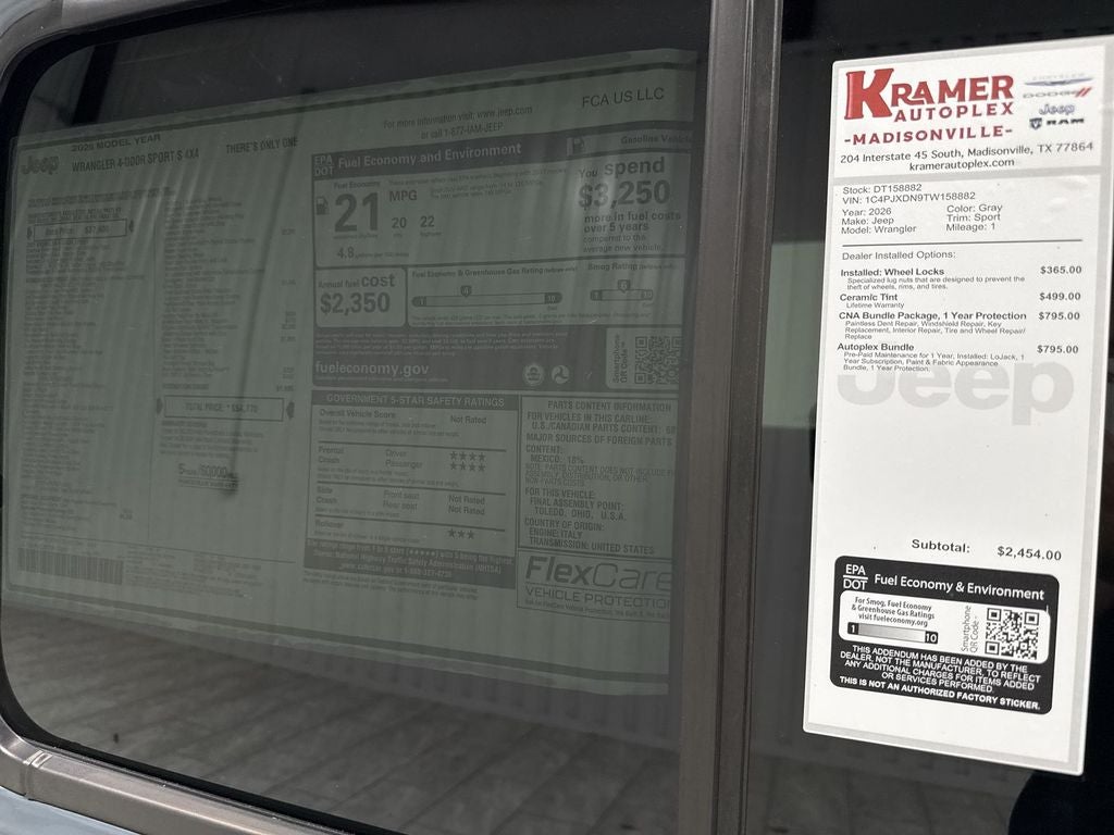 2026 Jeep Wrangler Sport S 4WD - located in Madisonville, TX - brings rugged capability and modern comfort to every drive. Powered by a responsive 2.0L turbocharged 4-cylinder gasoline engine and a proven 4WD system, this Jeep Wrangler Sport S delivers confident on- and off-road performance with efficient power delivery and precise handling. Inside, the cabin balances durable materials with thoughtful features. Automatic climate control keeps the interior comfortable in changing Texas weather, while a heated steering wheel adds warmth and comfort during cooler mornings. Safety is prioritized with Forward Collision Warning, Back-Up Camera, and Rear Parking Sensors to help prevent accidents and simplify maneuvering in tight spaces. The Jeep Wrangler Sport S retains iconic Jeep styling with contemporary touches, offering removable tops and doors for open-air freedom when desired. Seating is supportive for long journeys and everyday errands, and cargo flexibility adapts to gear for weekend adventures. Technology and convenience combine to make this Jeep Wrangler both practical and fun. Located in Madisonville, TX, this 2026 Jeep Wrangler Sport S is ready for those who want a capable 4WD vehicle that blends heritage off-road ability with modern safety and comfort features. Contact us to schedule a test drive and experience the versatile performance of this Jeep in person.