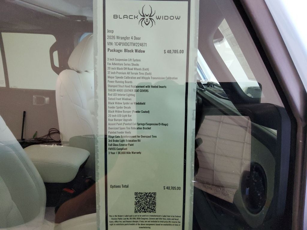 Convenience Group: Emergency/Assistance Call; 2-Door Passive Entry. Front Door Locks; Remote Start System; Cluster 7.0" TFT Color Display; Universal Garage Door Opener; Heated Front Seats; Air Conditioning W/Auto Temp Control; Heated Steering Wheel; Air Filtering. Quick Order Package 24W Willys: 7 & 4 Pin Wiring Harness; Conventional Differential Front Axle; 4-Wheel Drive Swing Gate Decal; Black Grille W/Gloss Black Rings; MOPAR All-Weather Floor Mats; Injection Molded Black Rear Bumper; Dana M210 Wide HD Tube Front Axle; Daytime Running Lamps LED Accents; Front LED Fog Lamps; LED Premium Reflector Headlamps; E-Locker Rear Axle; Corning Gorilla Glass; Security Alarm; 4.10 Rear Axle Ratio; 5. 675 lbs GVWR; Class II Receiver Hitch; Mold In Color Bumper W/Gloss Black; Advanced Brake Assist; Willy's Suspension; LT285/70R17C BSW Mud Terrain Tires; Automatic Headlamps; Deep Tint Sunscreen Windows; Off-Road Plus Mode; 17" X 7.5" Painted Black Wheels; Willys Hood Decal; Full Speed Forward Collision Warning Plus; Rock Protection Sill Rails; Power Heated Mirrors; Enhanced Adaptive Cruise Control; Auxiliary Switches; Dana M220 Wide Rear Axle; Molded in Color Rubicon Highline Flare; Premium Wrapped Steering Wheel; Sun Visors W/Illuminated Vanity Mirrors. Trailer Tow & Aux Switch Group (DISC): Class II Receiver Hitch; 7 & 4 Pin Wiring Harness; Auxiliary Switches. Steel Power Dome Hood Package: Power Dome Dual Vented Hood. Quick Order Package 23W Willys: 7 & 4 Pin Wiring Harness; Conventional Differential Front Axle; 4-Wheel Drive Swing Gate Decal; Black Grille W/Gloss Black Rings; MOPAR All-Weather Floor Mats; Injection Molded Black Rear Bumper; Dana M210 Wide HD Tube Front Axle; Daytime Running Lamps LED Accents; Front LED Fog Lamps; LED Premium Reflector Headlamps; E-Locker Rear Axle; Corning Gorilla Glass; Security Alarm; 4.10 Rear Axle Ratio; 5. 675 lbs GVWR; Class II Receiver Hitch; Mold In Color Bumper W/Gloss Black; Advanced Brake Assist; Willy's Suspension; LT285/70R17C BSW Mud Terrain Tires; Automatic Headlamps; Deep Tint Sunscreen Windows; Off-Road Plus Mode; 17" X 7.5" Painted Black Wheels; Willys Hood Decal; Full Speed Forward Collision Warning Plus; Rock Protection Sill Rails; Power Heated Mirrors; Enhanced Adaptive Cruise Control; Auxiliary Switches; Dana M220 Wide Rear Axle; Molded in Color Rubicon Highline Flare; Premium Wrapped Steering Wheel; Sun Visors W/Illuminated Vanity Mirrors. Black 3-Piece Hard Top. MOPAR Hinge-Gate Reinforcement. Black Clearcoat. MOPAR Multi-Function Accessory Rail. **Equipment listed is based on original vehicle build and subject to change. Please confirm the accuracy of the included equipment by calling the dealer prior to purchase.**