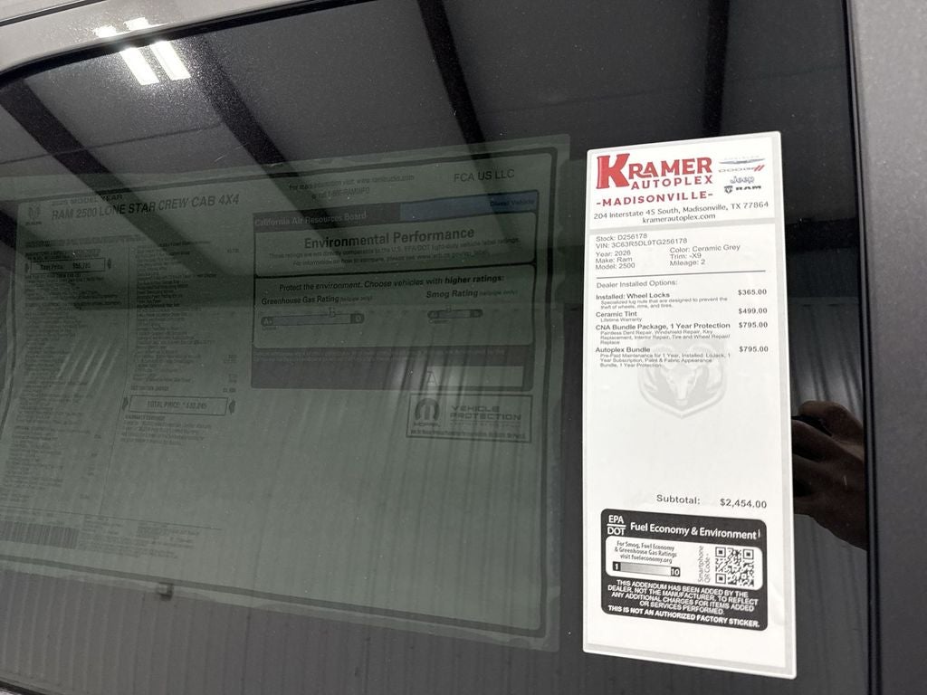 2026 Ram 2500 Lone Star 4WD — powerful capability meets refined comfort in Madisonville, TX. Powered by a stout 6-cylinder 6.7L Diesel engine, this Ram 2500 delivers exceptional torque for towing, confident highway passing, and reliable worksite performance. The Lone Star trim blends rugged utility with premium features, making it the ideal choice whether you're hauling equipment or heading out on a weekend adventure. Equipped with 4-wheel drive and an Off-Road Package, this truck is ready for rough terrain, muddy trails, and tough jobs. Safety and convenience are prioritized with Forward Collision Warning and Rear Parking Sensors to help prevent collisions and make maneuvering simple in tight spaces. The heated steering wheel adds year-round comfort, and Hands Free Bluetooth® keeps calls and audio seamless while you focus on the road. Located in Madisonville, TX, this 2026 Ram 2500 Lone Star is competitively priced — the best price available locally — offering outstanding value for a heavy-duty diesel pickup with premium tech and off-road capability. Whether you need a dependable work truck or a versatile daily driver, this Ram balances power, technology, and comfort. Schedule a test drive in Madisonville today and feel the difference of the 6.7L Diesel Ram 2500. Don't miss this opportunity to own a top-performing 4WD Lone Star at the best price in the area.