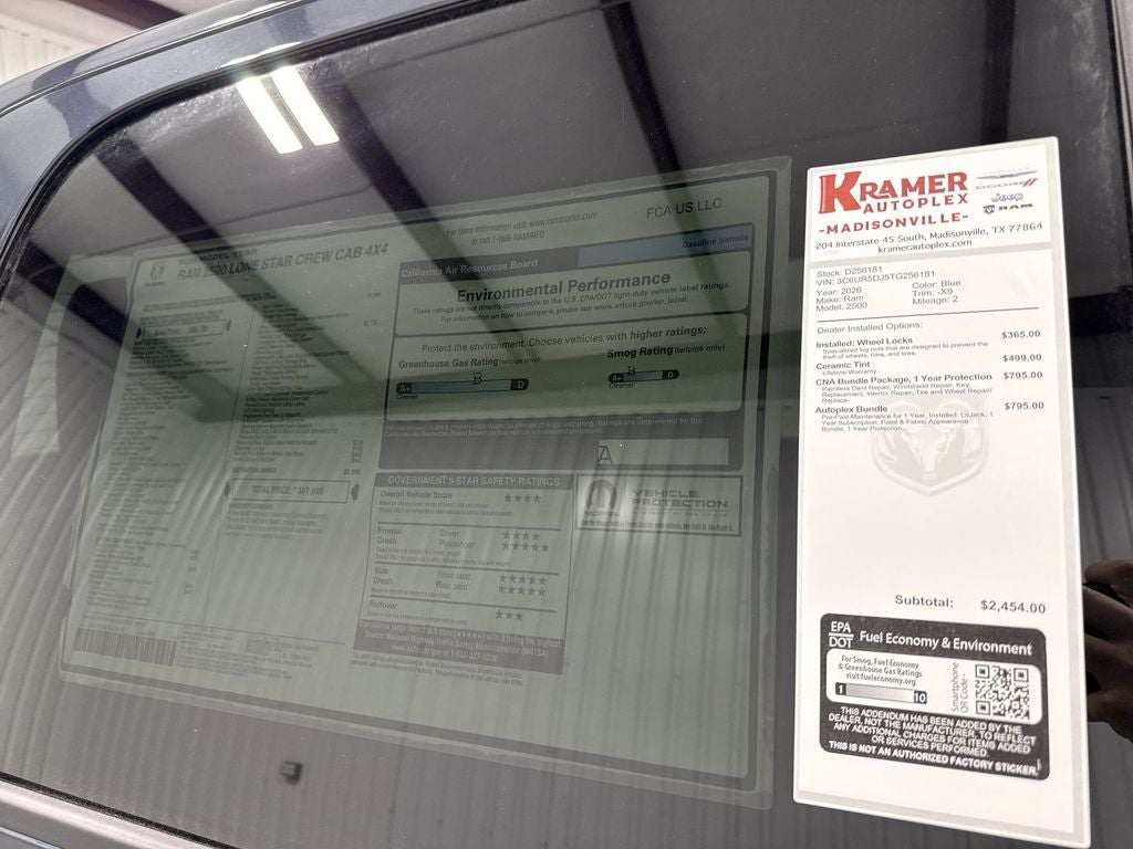 2026 Ram 2500 Lone Star 4WD — V8 6.4L Gasoline, Remote Start, Navigation - Madisonville TX Discover rugged capability and premium comfort with this 2026 Ram 2500 Lone Star 4WD, located in Madisonville, TX. Powered by a proven 6.4L V8 gasoline engine, this heavy-duty pickup delivers impressive towing and hauling performance while providing a refined driving experience for work or weekend adventures. The Lone Star trim balances toughness and convenience with thoughtful features that enhance every drive. Key features include Remote Start for effortless climate control, XM Radio for unmatched entertainment on long hauls, integrated Navigation to keep you on course, a Heated Steering Wheel for chilly mornings, and Apple CarPlay for seamless smartphone integration. Four-wheel drive gives you confidence on rough roads and in adverse weather, making this Ram 2500 a reliable partner year-round. This Ram 2500 Lone Star is competitively priced and represents the best price available in the Madisonville, TX area — high value without compromising capability. Whether you need a dependable work truck or a comfortable daily driver with serious towing capacity, this vehicle checks the boxes. Contact us today to schedule a test drive in Madisonville, TX and experience the performance and features of this 2026 Ram 2500 Lone Star for yourself. Best price — act now.