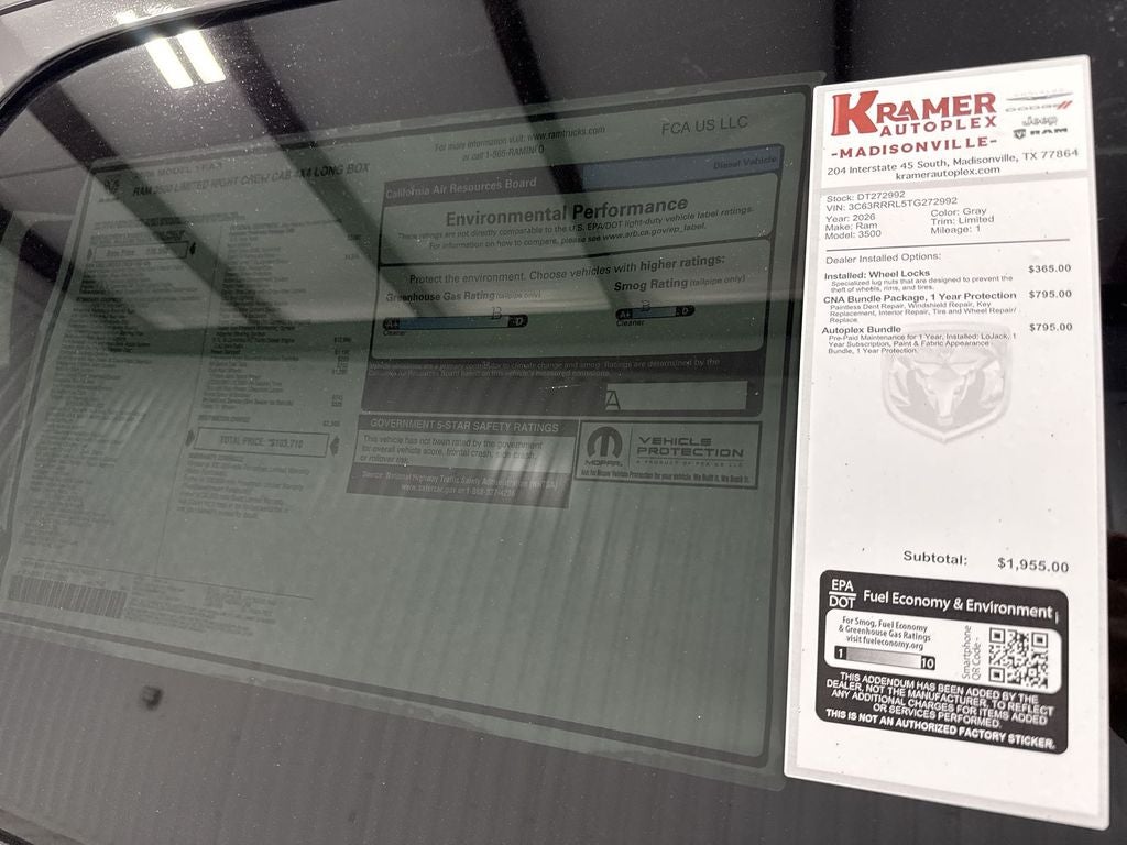 2026 Ram 3500 Limited 4WD Crew Cab - Built for heavy-duty performance and refined comfort. Located in Madisonville, TX, this dual-rear-wheel powerhouse is equipped with a 6-cylinder, 6.7L Diesel engine engineered for serious towing and hauling. The Limited trim brings premium leather seating, advanced driver aids, and a quiet, well-appointed cabin for long days on the job or weekend adventures. Safety and convenience features include Forward Collision Warning and a Back-Up Camera to help you maneuver confidently, plus Hands-Free Bluetooth® and Android Auto for seamless smartphone integration. Factory Navigation keeps you on course whether you're heading across state lines or making deliveries around town. The dual rear wheels provide exceptional stability under load, while 4WD capability adds traction in challenging conditions. This Ram 3500 Limited combines rugged capability with luxury touches and intuitive technology, making it an ideal choice for contractors, fleet managers, and drivers who demand both capability and comfort. Located in Madisonville, TX, this truck is ready for inspection and test drives. Contact us to schedule a viewing and experience firsthand the strength, refinement, and advanced features of this 2026 Ram 3500 Limited.
