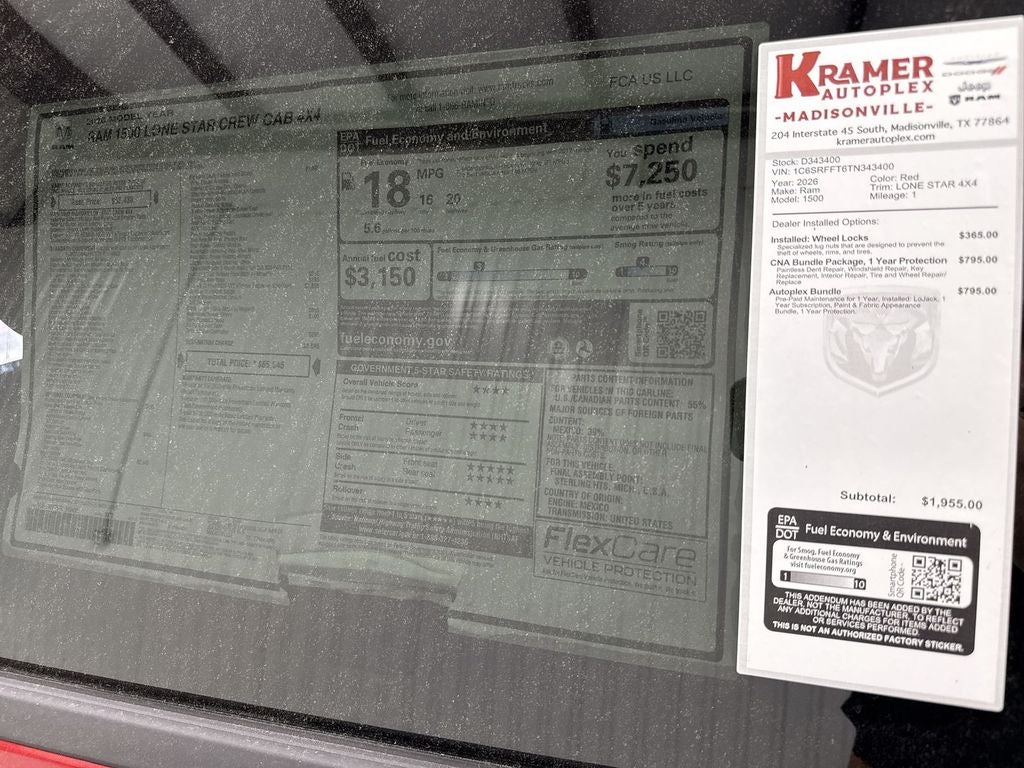 2026 Ram 1500 Lone Star 4WD V8 — Madisonville TX — Best Price Looking for a powerful, reliable pickup in Madisonville TX? This 2026 Ram 1500 Lone Star 4WD with the legendary 5.7L V8 gasoline engine delivers commanding performance, confident towing, and rugged capability for work and weekend adventures. With a spacious cabin and premium Lone Star features, this Ram 1500 balances comfort and utility for Texas roads. Tech and safety are well covered: Android Auto keeps your apps and navigation connected on the go, Hands Free Bluetooth® lets you take calls without taking your hands off the wheel, and a Back-Up Camera combined with Rear Parking Sensors makes maneuvering in tight spots simple. Forward Collision Warning adds an extra layer of safety, helping you avoid potential hazards before they become problems. This Ram 1500 Lone Star stands out for its muscular V8 power, durable 4WD system, and practical bed and towing setup—ideal for hauling equipment, trailers, or recreational gear. Located in Madisonville TX, this truck is priced aggressively to move quickly. If you want a dependable, feature-rich pickup with strong performance and modern connectivity, this 2026 Ram 1500 Lone Star 4WD offers the best price in the area. Schedule a test drive today and experience the difference in person.