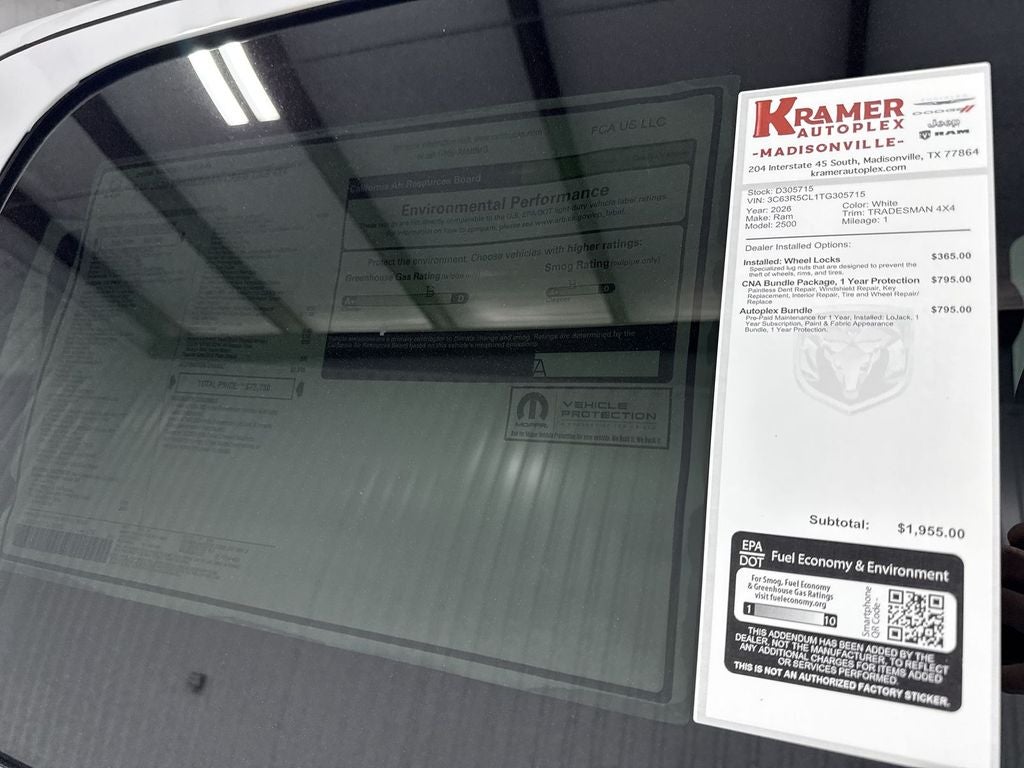 Discover the power and dependability of this 2026 Ram 2500 Tradesman 4WD, now available in Madisonville, TX. Built to handle the toughest jobs, this heavy-duty pickup features a rugged 6-cylinder, 6.7L diesel engine that delivers exceptional torque, towing capacity, and fuel efficiency for long hauls and demanding work sites. Whether you're hauling equipment or towing trailers, the Ram 2500 Tradesman is engineered to perform. Loaded with modern tech and convenience, this Tradesman includes Apple CarPlay and Android Auto for seamless smartphone integration, Hands Free Bluetooth® for safer calls on the go, and a Back-Up Camera plus Rear Parking Sensors to assist with maneuvering and jobsite parking. The interior focuses on utility and comfort, making daily drives and long trips more productive and enjoyable. Located in Madisonville, TX, this Ram 2500 Tradesman is competitively priced — offering the best price for buyers seeking value without sacrificing capability. Don't miss the chance to own a powerful diesel workhorse that blends classic Ram durability with contemporary connectivity and safety features. Act now to secure this 2026 Ram 2500 Tradesman 4WD in Madisonville, TX. Contact us today to schedule a test drive and experience the strength, reliability, and technology that make this Ram an outstanding choice for contractors, fleet buyers, and heavy-duty truck enthusiasts.