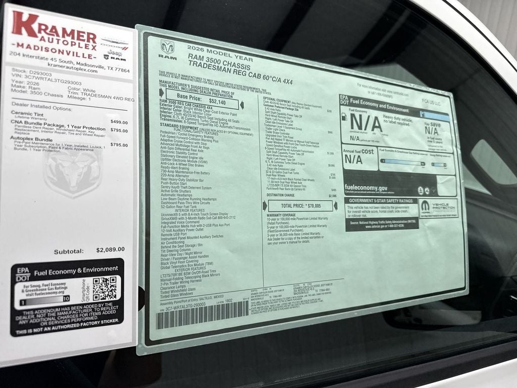 Discover the powerful and reliable 2026 Ram 3500 Chassis Tradesman 4WD, now available in Madisonville, TX. Built for demanding work sites and towing tasks, this dual rear wheel diesel powerhouse features a robust 6-cylinder, 6.7L Cummins engine engineered for torque, long-haul durability, and exceptional payload capacity. The Tradesman trim focuses on function and strength while delivering modern driver conveniences. This Ram 3500 is equipped with Hands Free Bluetooth®, Android Auto, and Apple CarPlay for seamless smartphone integration and safer in-cab connectivity on long drives. Safety technologies include Forward Collision Warning and Adaptive Cruise Control to help prevent incidents and reduce driver fatigue during highway travel. The 4WD drivetrain and dual rear wheels provide enhanced stability and traction in challenging road conditions and under heavy loads, making this chassis cab ideal for contractors, fleet operators, and towing professionals. Located in Madisonville, TX, this 2026 Ram 3500 Chassis Tradesman is competitively priced and represents the best value on the market today. Whether you need a dependable work truck that handles rigorous jobsite demands or a versatile commercial platform ready for upfits, this Ram delivers capability, safety, and connectivity. Contact us to schedule a test drive or to learn more about financing options and immediate availability.