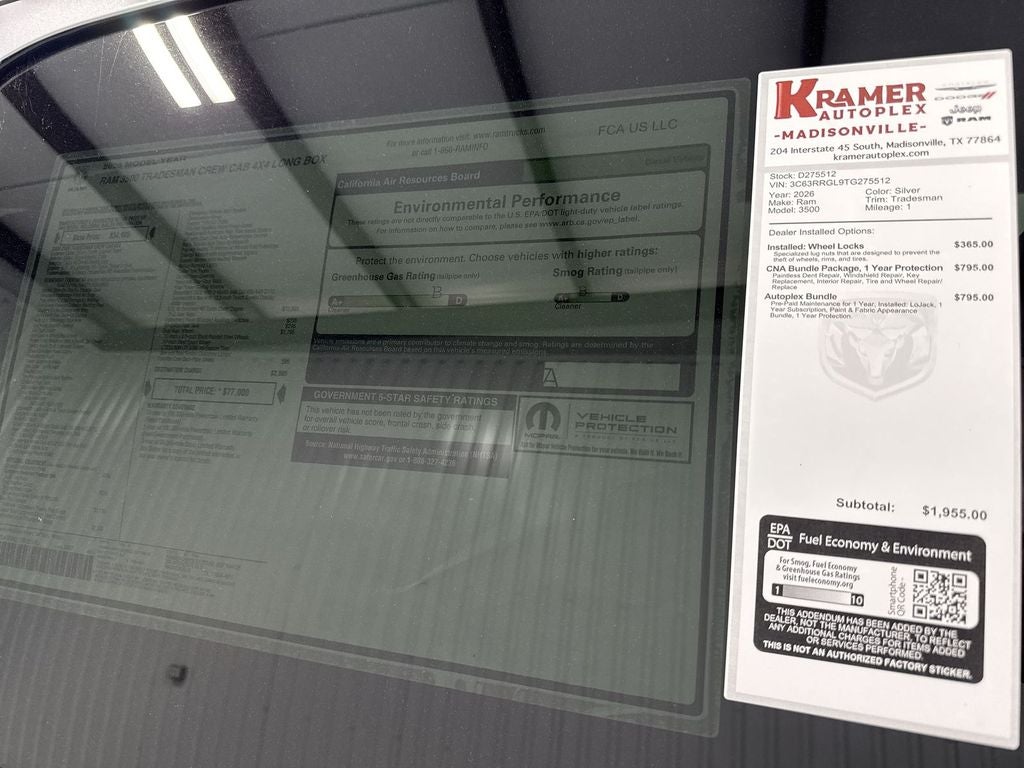 Experience power and capability with this 2026 Ram 3500 Tradesman 4WD Dually, now available in Madisonville, TX. Built for heavy-duty work and long hauls, this 6-cylinder, 6.7L diesel powerhouse delivers exceptional torque and towing performance while maintaining a refined, driver-focused interior. With dual rear wheels for superior stability under load, this Tradesman is engineered to handle serious payloads and demanding job sites. This Ram 3500 is equipped with modern connectivity and safety features to keep you confident on every route. Apple CarPlay and Android Auto integrate your smartphone for seamless navigation and entertainment. Hands-free Bluetooth® lets you stay connected without distraction. Adaptive Cruise Control simplifies highway driving and enhances safety on long trips. A Back-Up Camera provides clear rear visibility for maneuvering and hitching with precision. Located in Madisonville, TX, this Ram 3500 Tradesman offers rugged reliability with contemporary tech and comfort — perfect for contractors, fleet managers, or anyone who needs uncompromising capability. We're offering the best price in the area, giving you exceptional value on a top-tier heavy-duty truck. Whether towing equipment across town or powering through a workweek, this dually combines diesel strength, advanced features, and practical design. Contact us in Madisonville today to schedule a test drive and see why this 2026 Ram 3500 Tradesman 4WD Dual Rear Wheel is the smart choice for serious work and relentless performance.