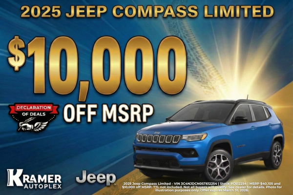 2025 Jeep Compass Limited - VIN 3C4NJDCN0ST612254 | Stock #C612254 | MSRP $40,105 and $10,000 off MSRP. TTL not included. Not all buyers will qualify. See dealer for details. Photo for illustration purposes only. Offer expires March 31, 2026.