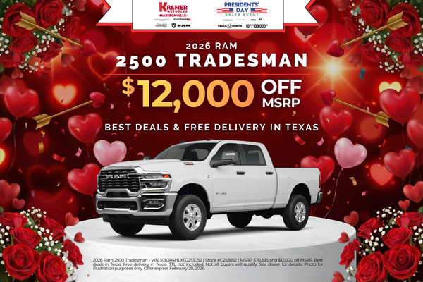 2026 Ram 2500 Tradesman - VIN 3C63R4HLXTG253052 | Stock #C253052 | MSRP $70,395 and $12,000 off MSRP. Best deals in Texas. Free delivery in Texas. TTL not included. Not all buyers will qualify. See dealer for details. Photo for illustration purposes only. Offer expires February 28, 2026.