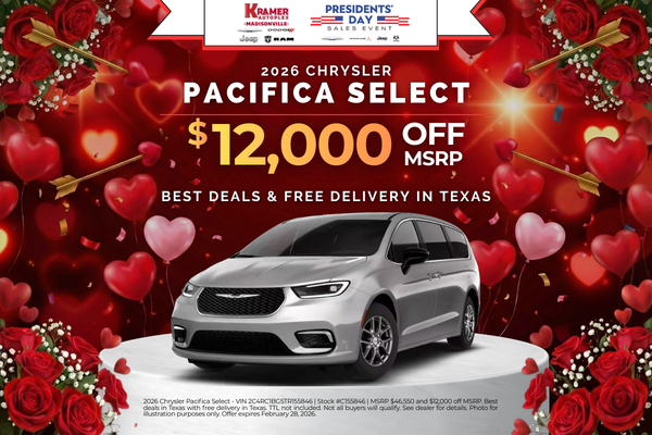 2026 Chrysler Pacifica Select - VIN 2C4RC1BG5TR155846 | Stock #C155846 | MSRP $46,550 and $12,000 off MSRP. Best deals in Texas with free delivery in Texas. TTL not included. Not all buyers will qualify. See dealer for details. Photo for illustration purposes only. Offer expires February 28, 2026.