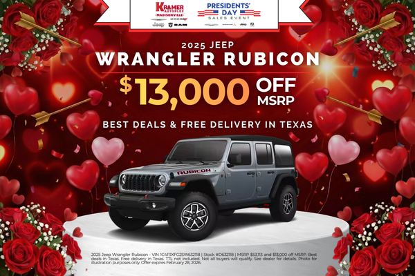 2025 Jeep Wrangler Rubicon - VIN 1C4PJXFG2SW632118 | Stock #D632118 | MSRP $53,113 and $13,000 off MSRP. Best deals in Texas. Free delivery in Texas. TTL not included. Not all buyers will qualify. See dealer for details. Photo for illustration purposes only. Offer expires February 28, 2026.