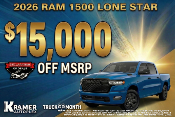 2026 RAM 1500 Lonestar - VIN 1C6SRFFT9TN257143 | Stock #DT257143 | MSRP $64,720 and $15,000 off MSRP. Qualified buyers can finance at 0% APR for 60 months. Discount or APR. TTL not included. Not all buyers will qualify. See dealer for details. Photo for illustration purposes only. Offer expires March 31, 2026.
