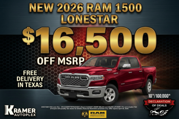 2026 RAM 1500 Lone Star - VIN 1C6SRFFT8TN293907 | Stock #C293907 | MSRP $66,235 and $16,500 off MSRP. TTL not included. Not all buyers will qualify. See dealer for details. Photo for illustration purposes only. Offer expires April 30, 2026.