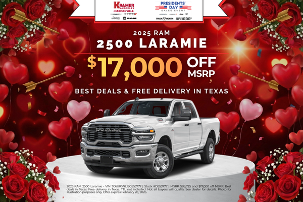 2025 RAM 2500 Laramie - VIN 3C6UR5NL1SG555777 | Stock #D555777 | MSRP $88,725 and $17,000 off MSRP. Best deals in Texas. Free delivery in Texas. TTL not included. Not all buyers will qualify. See dealer for details. Photo for illustration purposes only. Offer expires February 28, 2026.