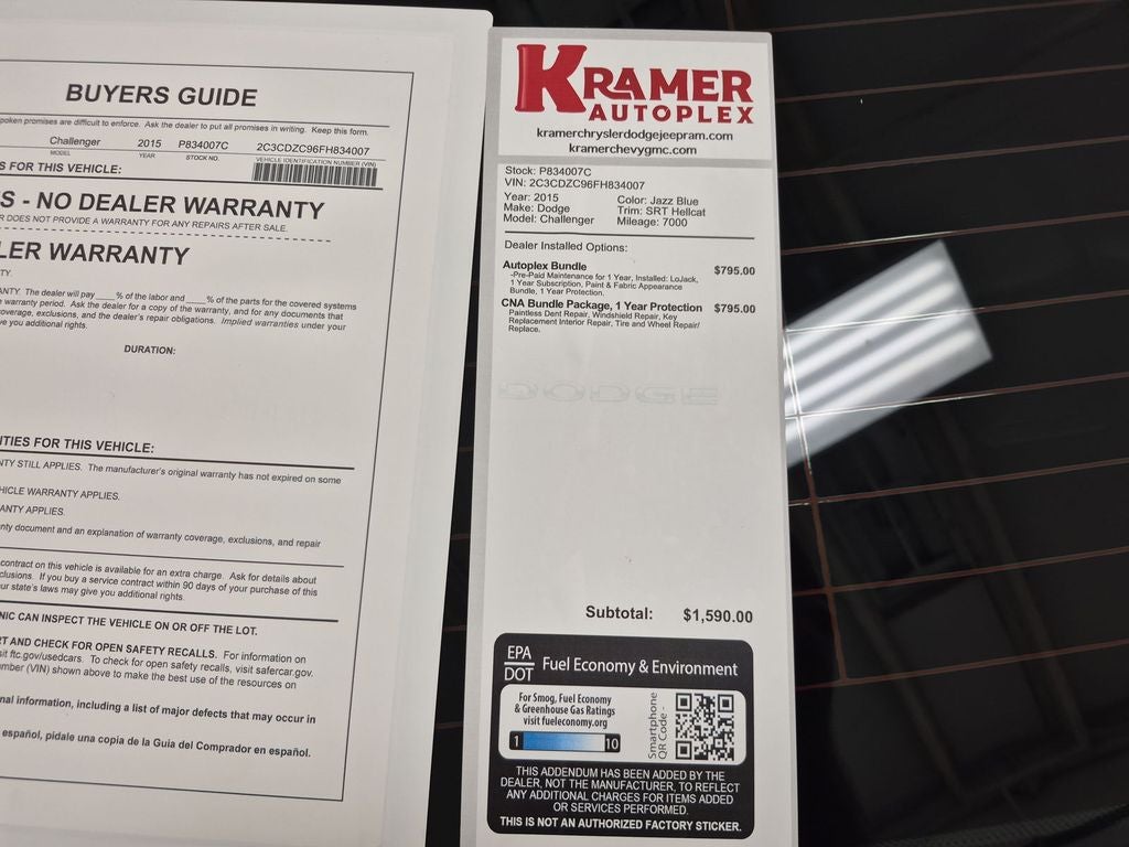 The rear parking assist technology on this mid-size car will put you at ease when reversing. The system alerts you as you get closer to an obstruction. See what's behind you with the back up camera on this unit. The leather seats in this mid-size car are a must for buyers looking for comfort, durability, and style. The vehicle offers Automatic Climate Control for personalized comfort. Bluetooth® technology is built into this mid-size car, keeping your hands on the steering wheel and your focus on the road. This 2015 Dodge Challenger has a clean CARFAX vehicle history report. This Dodge Challenger is equipped with the latest generation of XM/Sirius Radio. You'll never again be lost in a crowded city or a country region with the navigation system on this model. Keep your hands warm all winter with a heated steering wheel in this unit . This model has a V8, 6.2L high output engine.