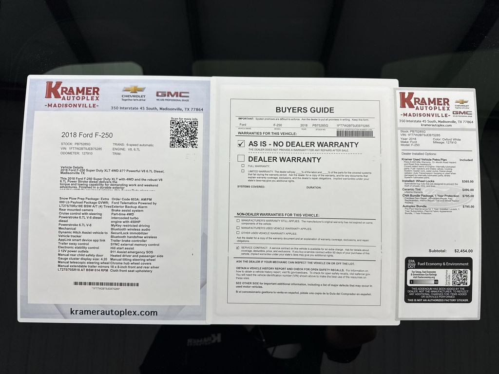 This model has a clean CARFAX vehicle history report. Protect it from unwanted accidents with a cutting edge backup camera system. Bluetooth® technology is built into this unit, keeping your hands on the steering wheel and your focus on the road. The vehicle has four wheel drive capabilities. It embodies class and sophistication with its refined white exterior. A trailer braking system is already installed on this vehicle. Set the temperature exactly where you are most comfortable in this model. The fan speed and temperature will automatically adjust to maintain your preferred zone climate. This unit has a V8, 6.7L high output engine. This model is outfitted with a Powerstroke diesel engine This model has an automatic transmission. This 2018 Ford F-250 Super Duty has a diesel engine. Easily set your speed in this Ford F-250 with a state of the art cruise control system. Increase or decrease velocity with the touch of a button.
