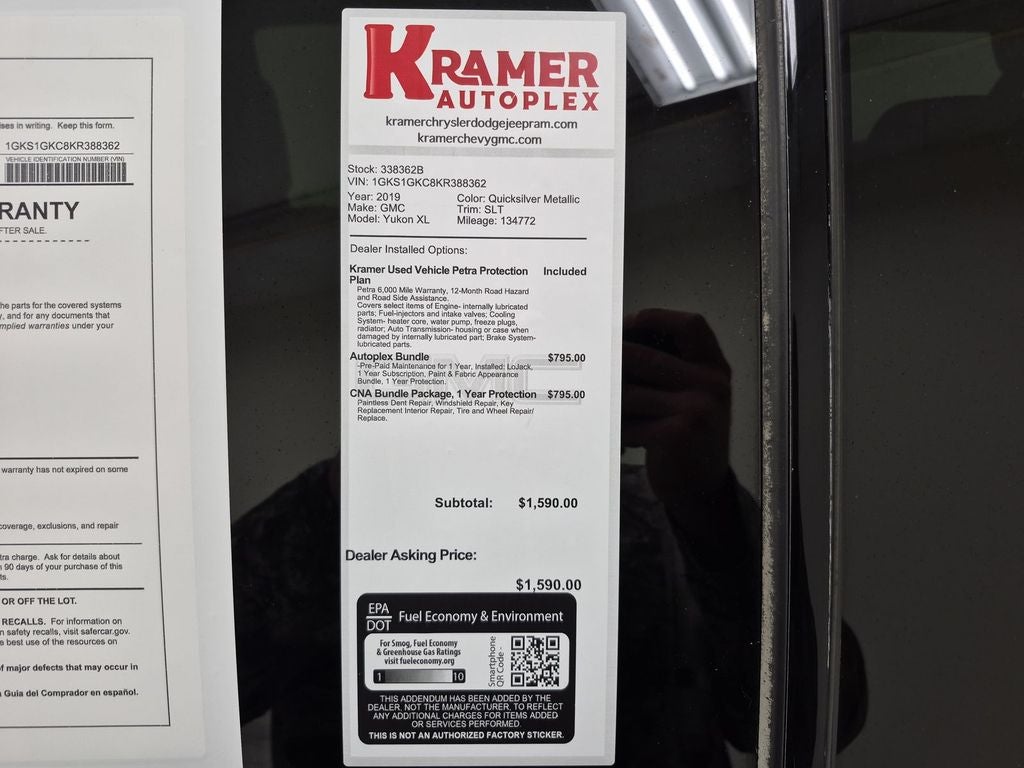 This vehicle stays safely in its lane with Lane Keep Assist. This 2019 GMC Yukon XL 1500 is equipped with the latest generation of XM/Sirius Radio. This model features a hands-free Bluetooth® phone system. Start it from inside with remote start. Keep your hands warm all winter with a heated steering wheel in this 2019 GMC Yukon XL 1500 . Engulf yourself with the crystal clear sound of a BOSE sound system in this model. This GMC Yukon XL has a clean CARFAX vehicle history report. This 1/2 ton suv offers Apple CarPlay for seamless connectivity. The GMC Yukon XL's Cross-Traffic Alert: Safeguarding you from unexpected traffic when reversing. This unit comes equipped with Android Auto for seamless smartphone integration on the road. Protect the GMC Yukon XL from unwanted accidents with a cutting edge backup camera system. The rear parking assist technology on this GMC Yukon XL will put you at ease when reversing. The system alerts you as you get closer to an obstruction.