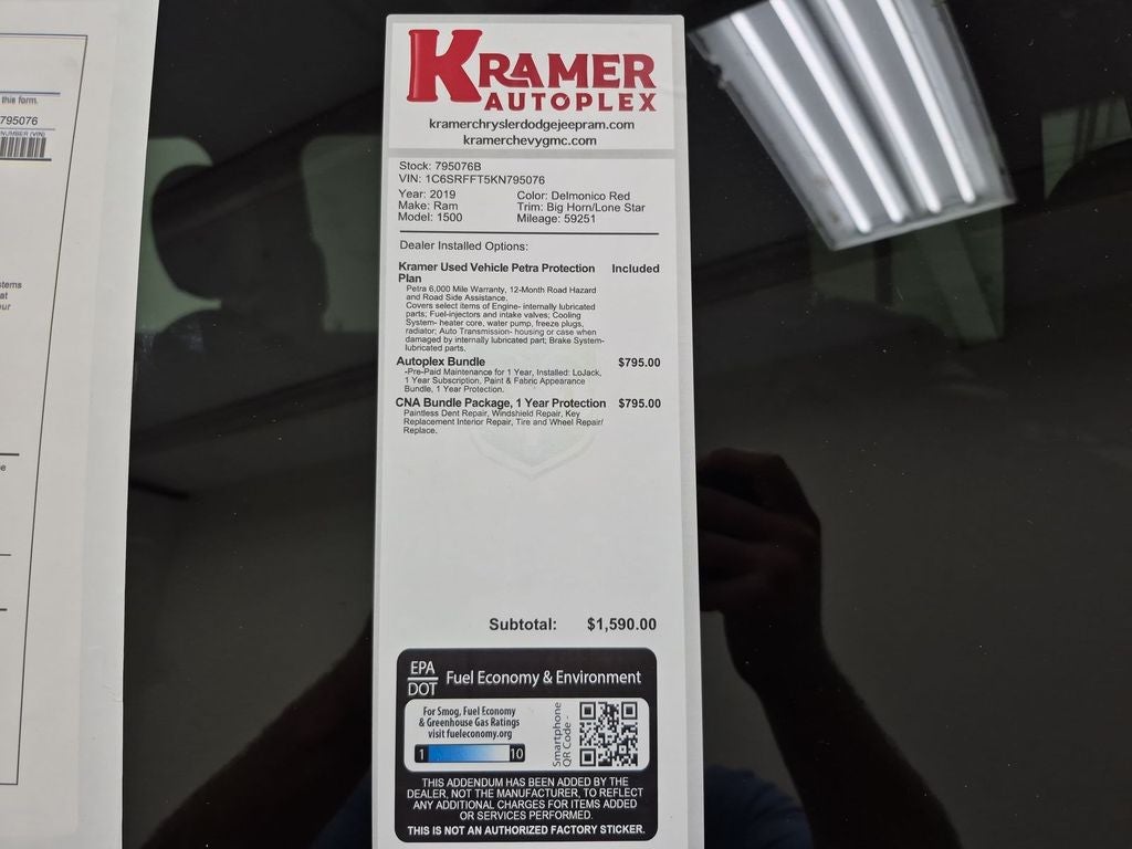 Our dealership has already run the CARFAX report and it is clean. A clean CARFAX is a great asset for resale value in the future. See what's behind you with the back up camera on this 2019 Ram 1500 . It comes equipped with Android Auto for seamless smartphone integration on the road. This unit is equipped with the latest generation of XM/Sirius Radio. You'll never again be lost in a crowded city or a country region with the navigation system on this vehicle. Start this 2019 Ram 1500 from inside with remote start. The rear parking assist technology on this Ram 1500 will put you at ease when reversing. The system alerts you as you get closer to an obstruction. Apple CarPlay: Seamless smartphone integration for this Ram 1500 - stay connected and entertained on the go! This 2019 Ram 1500 is pure luxury with a heated steering wheel.