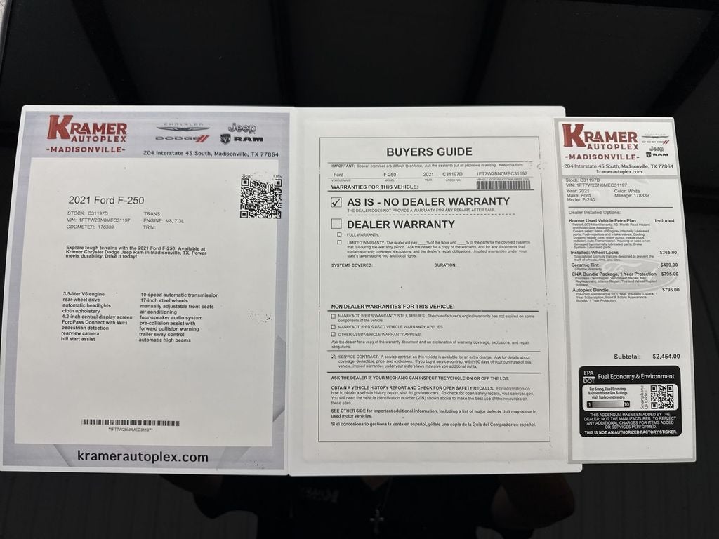 2021 Ford F-250 Super Duty XLT 4WD — Powerful V8, 7.3L Gasoline — Best Price in Madisonville TX Ready to work and built to dominate tough jobs, this 2021 Ford F-250 Super Duty XLT combines brute strength with modern convenience. Powered by the rugged 7.3L V8 gasoline engine and equipped with four-wheel drive, this truck delivers exceptional towing capacity, confident off-road traction, and dependable performance for every task. Comfort and technology meet in the spacious cabin, featuring Navigation for stress-free routing, Hands-Free Bluetooth® for safe calling and audio streaming, and Apple CarPlay for seamless smartphone integration. Remote Start ensures warm-up or cool-down on demand, while Rear Parking Sensors add confidence when maneuvering trailers or tight spots. This Ford F-250 Super Duty XLT includes durable interior materials, a commanding driving position, and practical storage for tools and gear. The exterior presents strong lines, a heavy-duty bed for hauling, and a suspension tuned for load-bearing reliability. Well-maintained and inspected, this truck represents top value for contractors, ranchers, fleet buyers, and anyone needing serious capability. Located in Madisonville TX, this 2021 Ford F-250 Super Duty XLT 4WD with the V8 7.3L gasoline engine is being offered at the best price — a rare combination of power, technology, and affordability. Schedule a test drive today and experience why this Ford F-250 stands out as the smart choice for demanding work and everyday driving.
