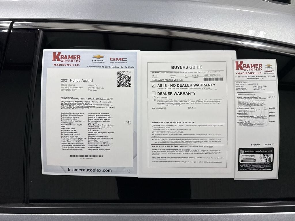 This 2021 Honda Accord Sport pairs efficient performance with confident handling, featuring a 1.5L 4-cylinder gasoline engine and smooth automatic transmission. With only 35,077 miles, this Honda Accord Sport delivers reliable daily driving and long-term value. Located in Madisonville, TX, this vehicle is competitively priced to be the best deal in the area.