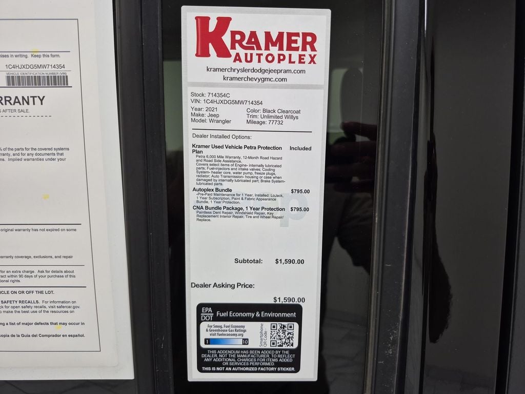 Cold Weather Group: Heated Front Seats; Heated Steering Wheel. Convenience Group: Remote Start System; Universal Garage Door Opener. Technology Group: Google Android Auto; Cluster 7.0" TFT Color Display; SiriusXM Satellite Radio; USB Host Flip; Integrated Center Stack Radio; 7.0" Touchscreen Display; Air Conditioning with Auto Temp Control; Uconnect 4 Radio with 7" Display; Apple CarPlay; Air Filtering; GPS Antenna Input. Quick Order Package 25W Willys (disc): Willys; Mold in Color Bumper with Gloss Black; Speed Sensitive Power Locks; Automatic Headlamps; Leather Wrapped Steering Wheel; Deep Tint Sunscreen Windows; Black Trail Rated Badge; 4-Wheel Drive Swing Gate Decal; Black Grille; MOPAR All-Weather Floor Mats; Willys Hood Decal; Rock Protection Sill Rails; LT255/75R17C Tires; Front 1-Touch Down Power Windows; Anti-Spin Differential Rear Axle; Power Heated Mirrors; Wrangler Decal; Matte Black Jeep Badge; Security Alarm; 17" X 7.5" Moab Black Aluminum Wheels; Remote Keyless Entry; Sun Visors with Illuminated Vanity Mirrors. LED Headlamp and Fog Lamp Group: Front LED Fog Lamps; LED Premium Reflector Headlamps. Quick Order Package 23W Willys: Willys; Mold in Color Bumper with Gloss Black; Speed Sensitive Power Locks; Automatic Headlamps; Leather Wrapped Steering Wheel; Deep Tint Sunscreen Windows; Black Trail Rated Badge; 4-Wheel Drive Swing Gate Decal; Black Grille; MOPAR All-Weather Floor Mats; Willys Hood Decal; Rock Protection Sill Rails; LT255/75R17C Tires; Front 1-Touch Down Power Windows; Anti-Spin Differential Rear Axle; Power Heated Mirrors; Wrangler Decal; Matte Black Jeep Badge; Security Alarm; 17" X 7.5" Moab Black Aluminum Wheels; Remote Keyless Entry; Sun Visors with Illuminated Vanity Mirrors. Black 3-Piece Hard Top. SiriusXM Satellite Radio. Black Clearcoat. Black Clearcoat. MOPAR All-Weather Floor Mats. **Equipment listed is based on original vehicle build and subject to change. Please confirm the accuracy of the included equipment by calling the dealer prior to purchase.**