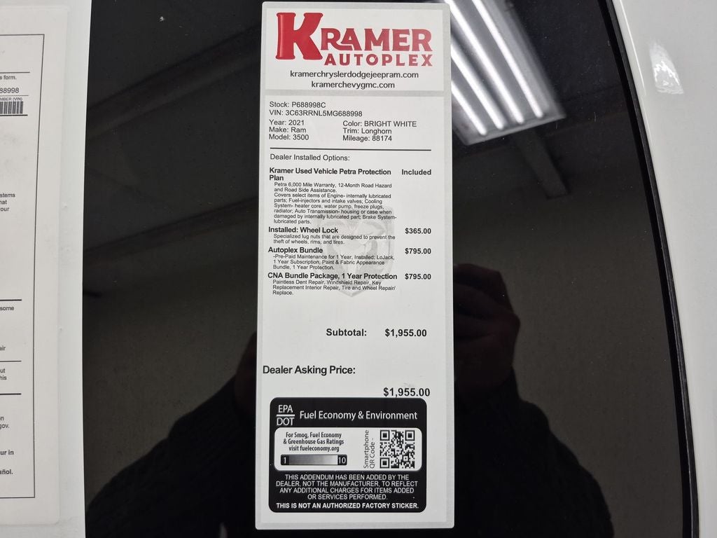 Quick Order Package 21K Longhorn. Longhorn Level 1 Equipment Group: 17 Speaker Harman Kardon Premium Sound; Blind Spot and Cross Path Detection; Ramcharger Wireless Charging Pad; Power Deployable Running Boards; Uconnect Radio 12.0 with Navigation. Towing Technology Group: Center Stop Lamp with Cargo View Camera; Surround View Camera System; Blind Spot and Cross Path Detection; Trailer Reverse Guidance. Body Color Bumper Group: Painted Front Bumper; Painted Rear Bumper. Dual Rear Wheels: Clearance Lamps; LT235/80R17E BSW AS Tires; Tire Pressure Monitoring Delete; 17" Steel Spare Wheel; Box and Rear Fender Clearance Lamps; 12.0" Dual Wheel Rear Axle; 6000# Front Axle with Hub Extension; 17" X 6.0" Premium Aluminum Wheels; 14. 000 lbs GVWR; Chrome Flat Cab-Length Side Steps; Rear Wheelhouse Liners. Auto Level Rear Air Suspension. Uconnect Radio 12.0 with Navigation. Blind Spot and Cross Path Detection. 5th Wheel/gooseneck Towing Prep Group. Center Stop Lamp with Cargo View Camera. Adaptive Steering System. Instrument Panel Mounted Auxiliary Switches. Clearance Lamps. **Equipment listed is based on original vehicle build and subject to change. Please confirm the accuracy of the included equipment by calling the dealer prior to purchase.**