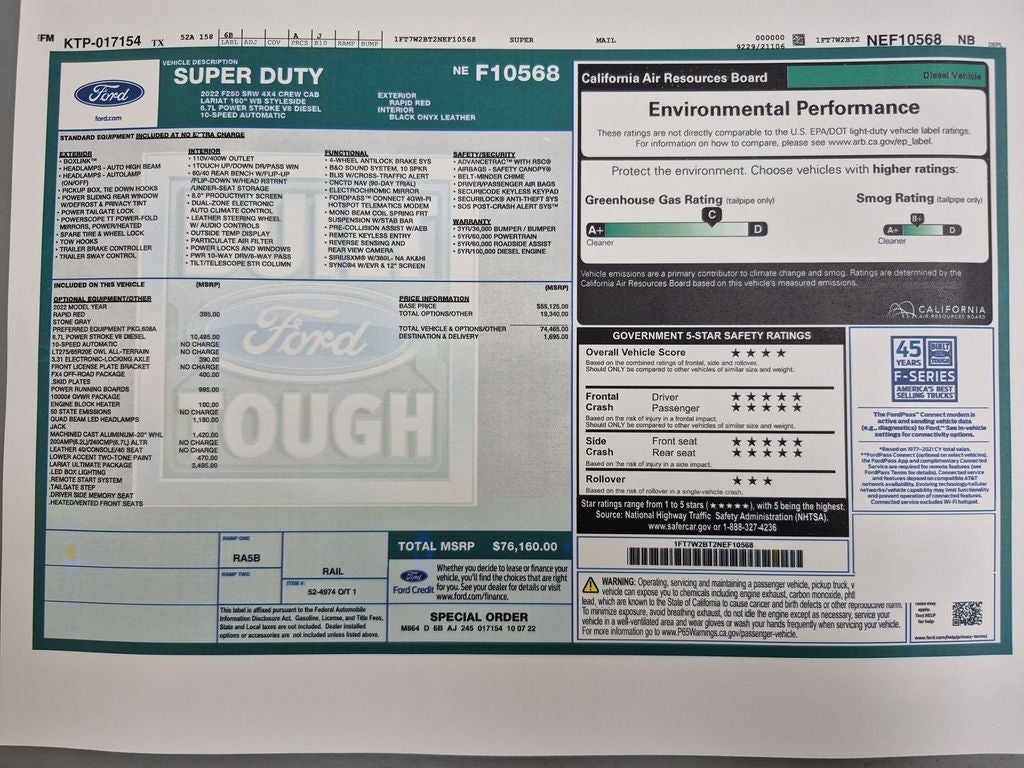 FX4 Off-Road Package: Transfer Case and Fuel Tank Skid Plates; Hill Descent Control; Off-Road Specifically Tuned Shock Absorbers; Unique FX4 Off-Road Box Decal. Lariat Ultimate Package: Power Heated/ventilated Driver Seat with Memory; PowerScope Trailer Tow Mirrors with Memory; Easy Entry/exit Memory Driver's Seat Feature; Tailgate Step and Handle; LED Box Lighting; Intelligent Access with Push-Button Start; Power Heated/ventilated Passenger Seat; Memory Power-Adjustable Pedals; Remote Start System; Ambient Lighting - Fixed Color; Power Telescoping/tilt Steering Wheel/column; Remote Tailgate Release; Wireless Charging Pad. Order Code 608A: Front Leather Seating Surfaces 40/console/40; 10. 000 Lb Payload Package GVWR; B&O Sound System by Bang and Olufsen. 20" Bright Machined Cast Aluminum Wheels. Quad Beam LED Headlamps and LED Taillamps. Power-Deployable Running Boards. Electronic-Locking with 3.31 Axle Ratio. Rapid Red Metallic TC. Rapid Red Metallic TC. Rapid Red Metallic TC. Tailgate Step and Handle. Remote Start System. Transfer Case and Fuel Tank Skid Plates. LED Box Lighting. **Equipment listed is based on original vehicle build and subject to change. Please confirm the accuracy