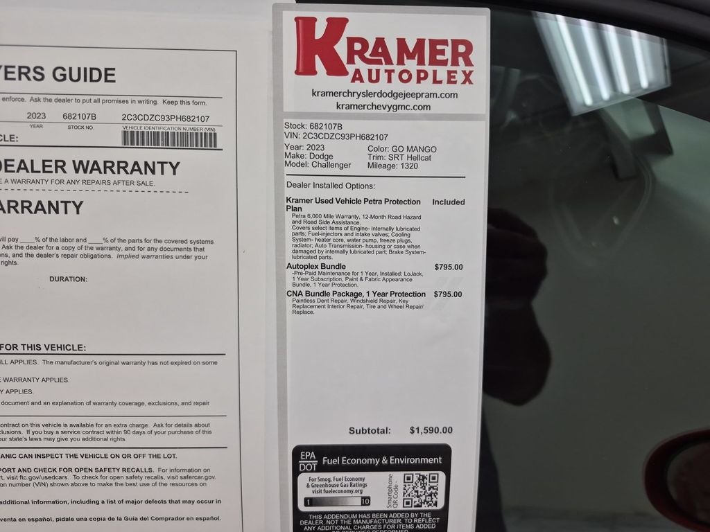 The Dodge Challenger is equipped with the latest generation of XM/Sirius Radio. The vehicle keeps you comfortable with Auto Climate. See what's behind you with the back up camera on this model. The rear parking assist technology on this Dodge Challenger will put you at ease when reversing. The system alerts you as you get closer to an obstruction. This mid-size car comes equipped with Android Auto for seamless smartphone integration on the road. Bluetooth® technology is built into this unit, keeping your hands on the steering wheel and your focus on the road. Our dealership has already run the CARFAX report and it is clean. A clean CARFAX is a great asset for resale value in the future. Keep your hands warm all winter with a heated steering wheel in this vehicle . Never get into a cold vehicle again with the remote start feature on this vehicle. You'll never again be lost in a crowded city or a country region with the navigation system on this 2023 Dodge Challenger .