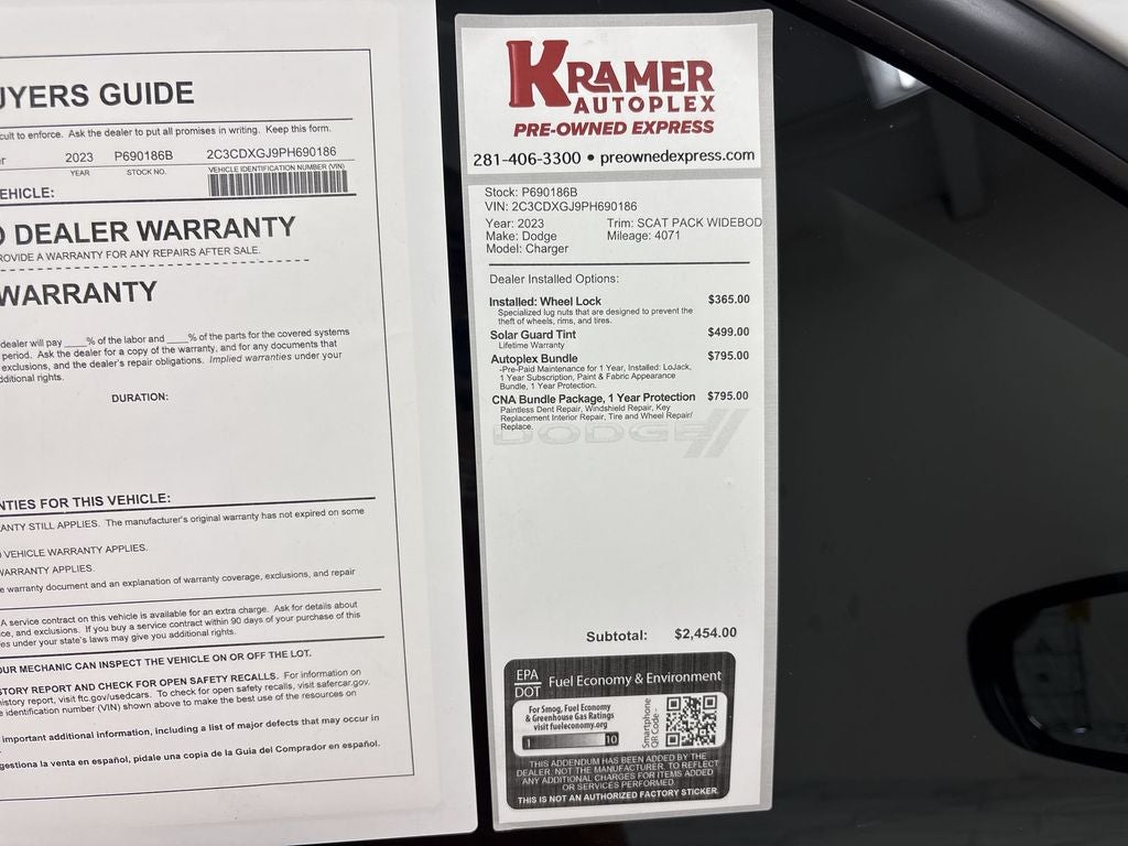 2023 Dodge Charger Scat Pack Widebody — 6.4L V8, RWD, 4,071 miles This striking 2023 Dodge Charger Scat Pack Widebody delivers raw performance and memorable presence with its potent 6.4L V8 gasoline engine and rear-wheel-drive layout. With just 4,071 miles, this low-mileage example is a rare find for enthusiasts seeking a powerful, well-preserved muscle sedan. Located in Livingston, TX, this Dodge Charger pairs aggressive widebody styling and track-capable handling with modern convenience and connectivity. Key features include industry favorites like Apple CarPlay and Android Auto for seamless smartphone integration, XM Radio for premium entertainment, and Remote Start for comfort and convenience in every season. The CARFAX 1-Owner history provides added confidence in the vehicle's background, enhancing its appeal to buyers who prioritize provenance and care. This Dodge Charger Scat Pack Widebody is competitively priced and advertised as the best price, offering exceptional value compared with similar examples on the market. Whether you're drawn to straight-line speed, distinctive design, or a commanding driving experience, this model checks every box. Schedule a test drive in Livingston, TX to experience the thunderous V8 and precision handling firsthand. With low mileage, desirable features, and a compelling price, this 2023 Dodge Charger Scat Pack Widebody won't be available for long.