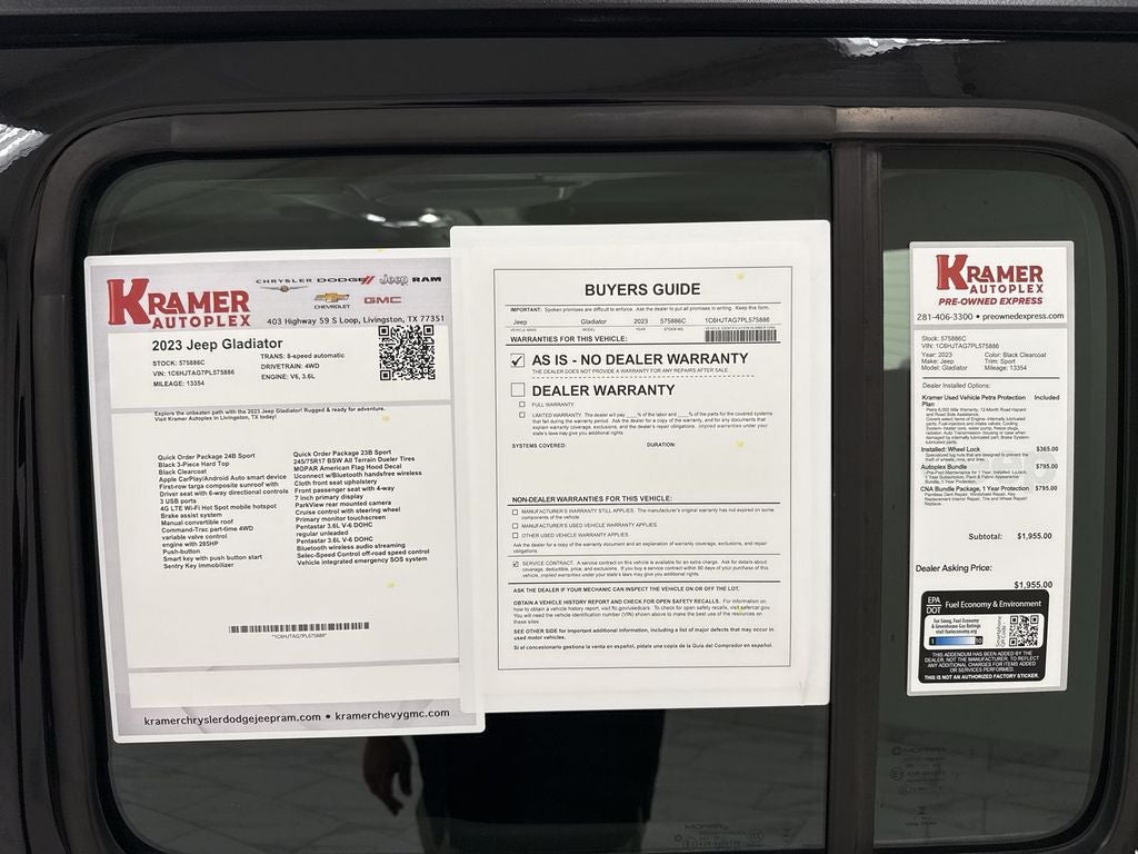 For sale in Livingston, TX: a rugged 2023 Jeep Gladiator Sport with only 13,354 miles. This Jeep Gladiator pairs a proven 3.6L V6 gasoline engine with 4WD capability, delivering strong performance on- and off-road. Well-equipped for daily driving and weekend adventures, features include Apple CarPlay, Android Auto, Hands-Free Bluetooth®, and an Off-Road Package that enhances traction and trail-ready confidence.