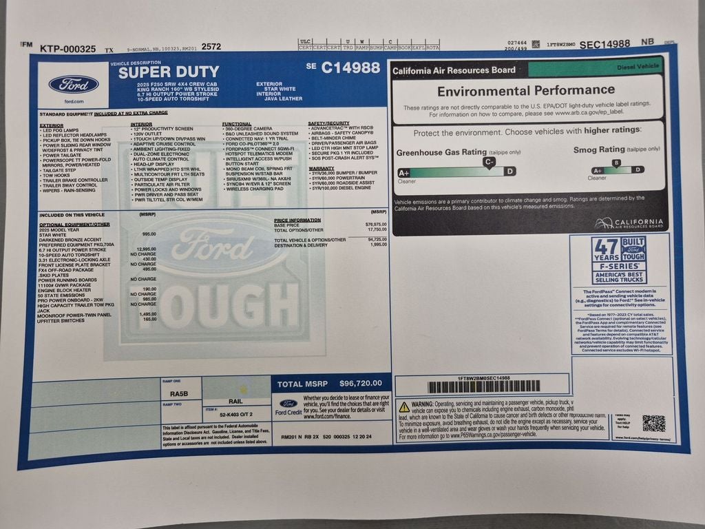 FX4 Off-Road Package: Transfer Case and Fuel Tank Skid Plates; Hill Descent Control; Off-Road Specifically Tuned Shock Absorbers; Unique FX4 Off-Road Box Decal. Order Code 700A: Unique King Ranch Leather 40/console/40 Seats; LT275/65Rx20E BSW A/T Tires; B&O Unleashed Sound System by Bang & Olufsen Radio. Twin Panel Power Moonroof. High Capacity 11.6" Axle Upgrade Package. Star White Metallic TC. Star White Metallic TC. Pro Power Onboard - 2kW. Electronic-Locking with 3.31 Axle Ratio. Upfitter Switches (6). **Equipment listed is based on original vehicle build and subject to change. Please confirm the accuracy of the included equipment by calling the dealer prior to purchase.**